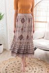 This darling skirt is a true beauty! We are so in love with the print, colors and fit! Features and elastic waistband, perfect tea length with a feminine ruffle hem. Get yours today!