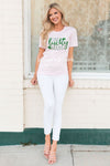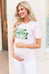 Shop our collection of the cutest St. Patrick's Day tops! "One Luck Mama" soft pink tee with gorgeous green lettering.