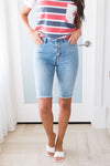 These Bermuda shorts will have you wishing summer was endless! We are loving the classic denim color these come in. It features cute front pockets, functional front fly buttons. Darling Frayed hem! These shorts are going to be your new go to on those sunny days!