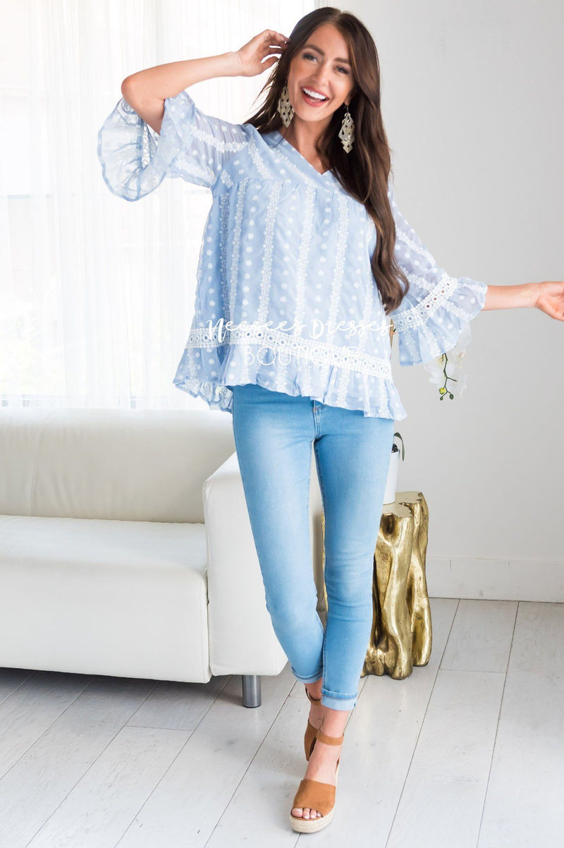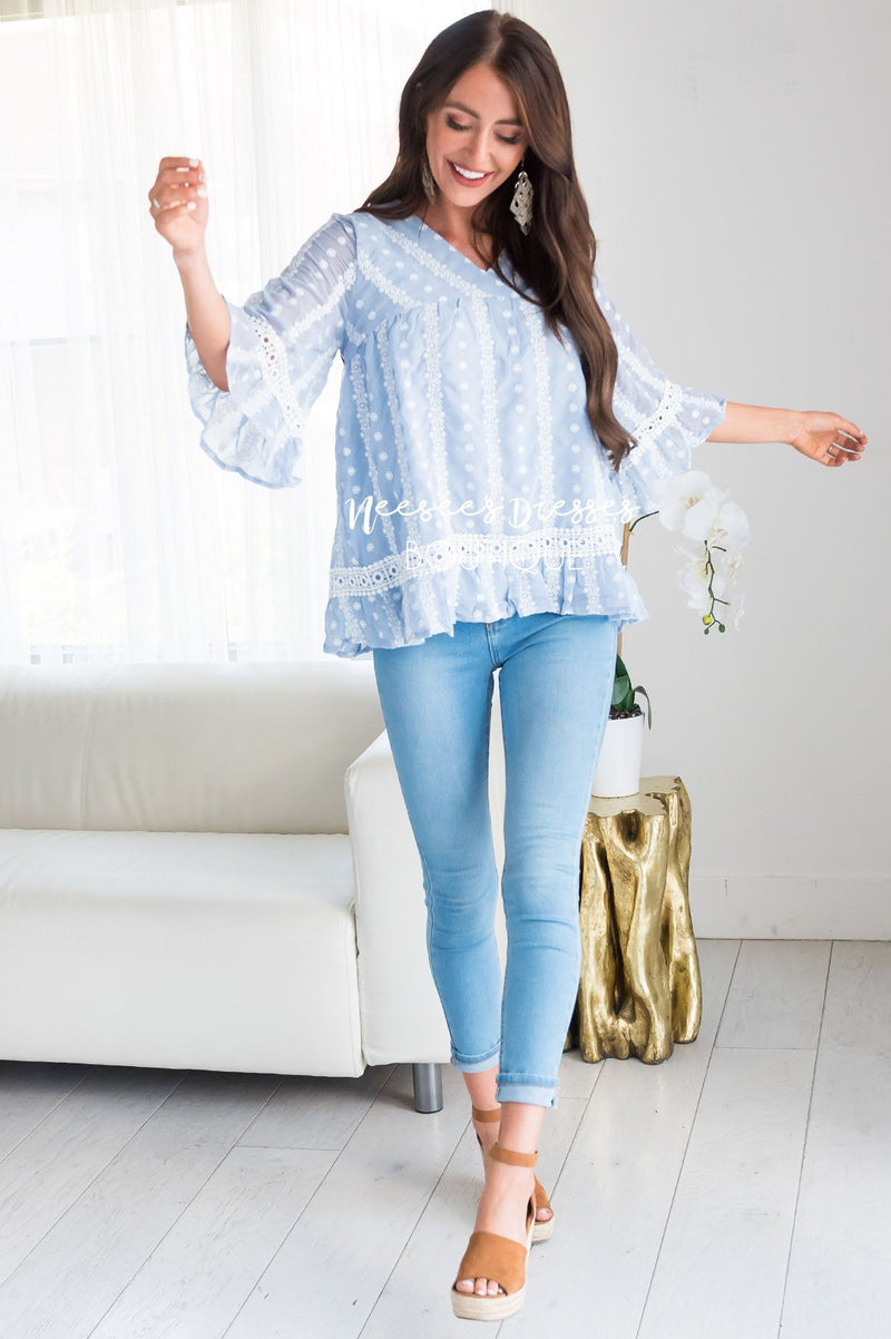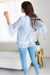 This new flowy top features a paisley floral print, lace trim details, half bell sleeves, a v neck line and a ruffle hem. This top is also lined and a total must have!