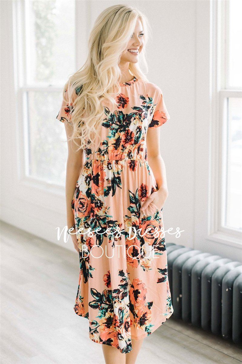 This dress is so soft, so comfy and oh so cute! Beautiful peachy pink spring dress features short sleeves, a pretty watercolor floral print, an elastic waist and has cute front pockets. Belt and accessories not included.