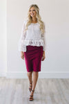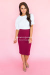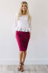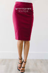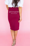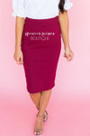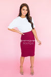 We absolutely adore this new pencil fit skirt! This slip on, stretchy, little cranberry skirt features a comfortable wide elastic waist.