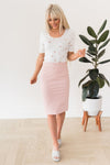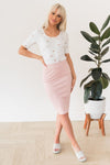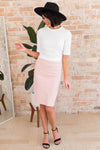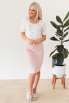 We absolutely adore this new pencil fit skirt! This slip on, stretchy, light blush pink skirt features a comfortable wide elastic waist and ribbed material.