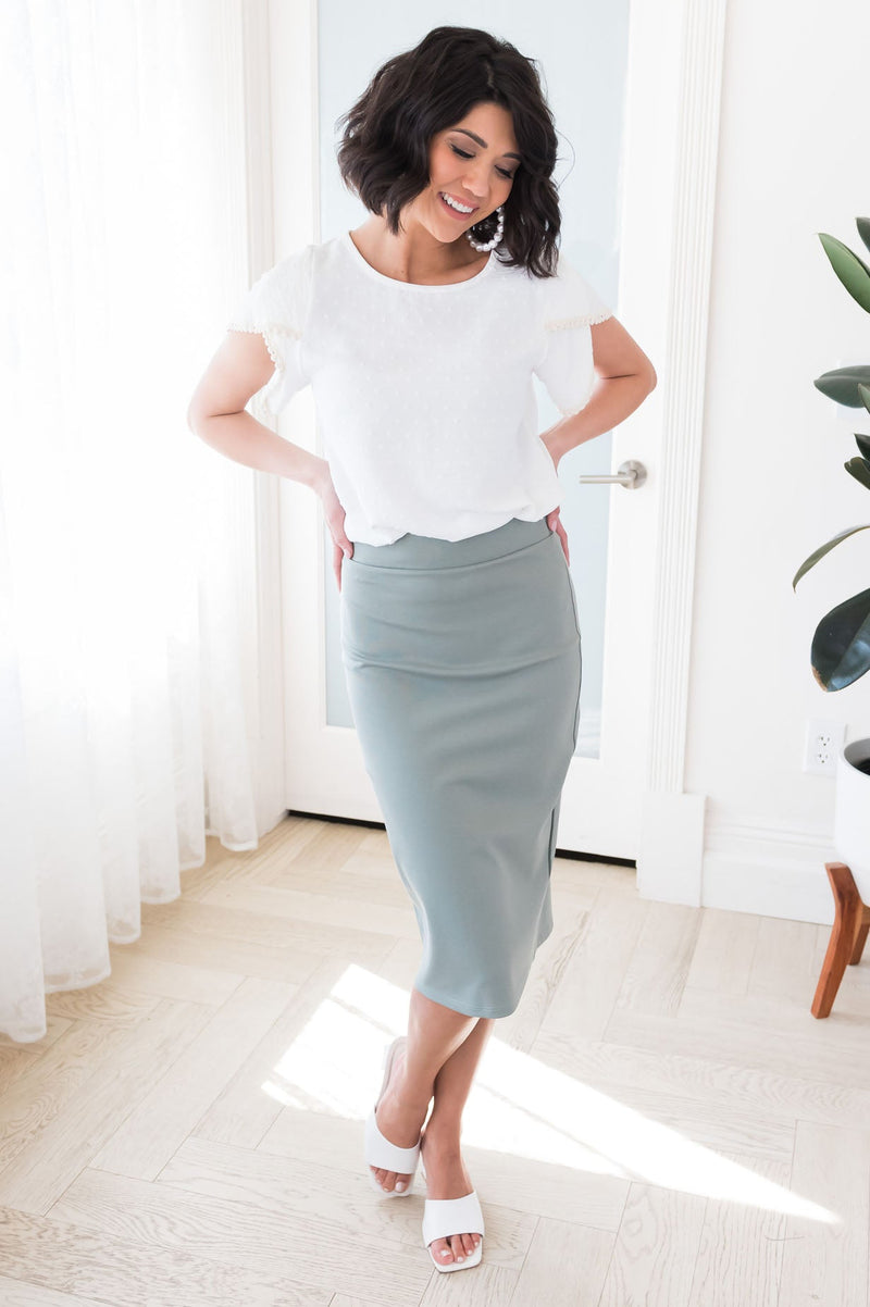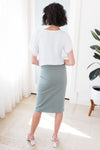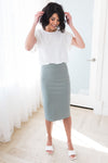 We absolutely adore this new pencil fit skirt! This slip on, stretchy, brush green skirt features a comfortable wide elastic waist and ribbed material.