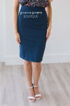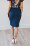 This adorable skirt is perfect for dressing up or dressing down! This cute little navy skirt features a perfect pencil fit and thick waist band.