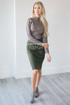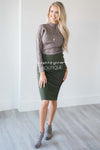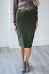 This adorable skirt is perfect for dressing up or dressing down! This cute little olive skirt features a perfect pencil fit and thick waist band.