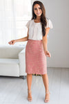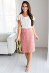 This woven tweed skirt is so rich and beautiful! The rose pink tweed has gold throughout making it so striking and so feminine! Skirt has back elastic waist and side zipper closure.