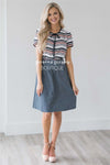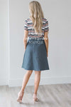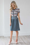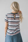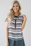 This top features the cutest pink navy and white striped print, with an adorable neck tie, short sleeves, and a keyhole back detail!