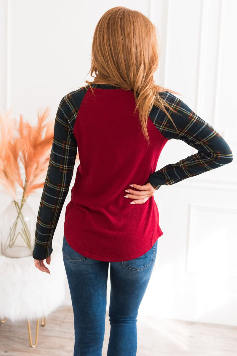 Looking for that perfect comfy, casual fun plaid top? Look no further because we have the one for you! That's right your eyes aren't playing tricks on you! Featuring long sleeves, casual fit, modest round neckline and the most gorgeous plaid print sleeves around!
