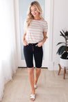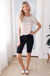 These Bermuda shorts will have you wishing it was summer already! We are loving the classic dark wash these come in. It features pockets, classic button fly and does have some stretch. These shorts are going to be your new go on those upcoming sunny days!
