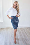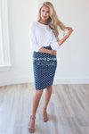 This is the perfect go-to pencil skirt! You will grab for for this timeless piece time and time again. Beautiful navy skirt features a white geo print and back zipper closure.