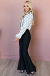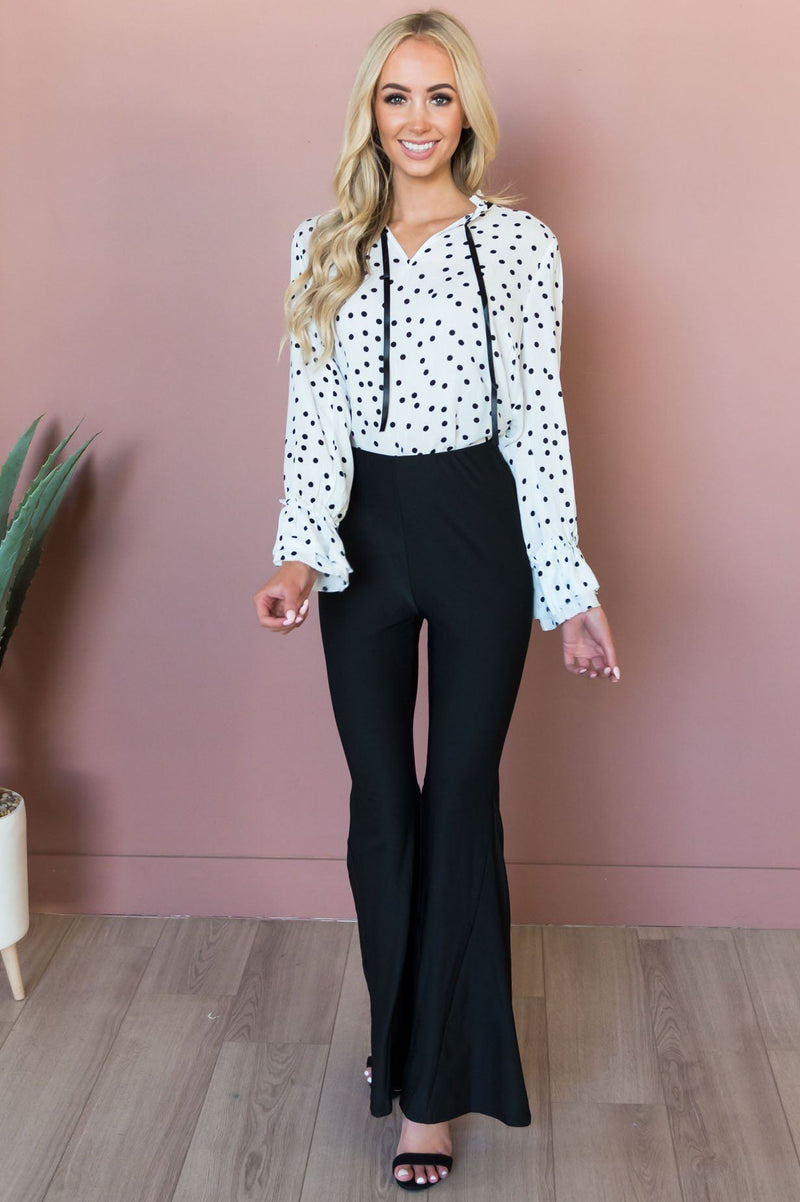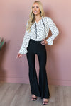 These trendy flare pants are such a must-have style for any season! We love the classyic black color paired with the super soft material. It's so easy to wear this style with a variety of vibrant blouses, layering tops, and cardigans!