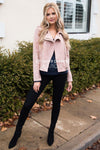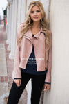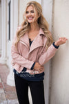 We love the sophisticated vibe of this jacket! Every girl needs a beautiful go-to jacket in their wardrobe. The soft pink color of this jacket is perfect for any spring color scheme. Create a statement outfit by pairing this jacket with your favorite jeans and booties! Features a zipper front, collared neck, fitted bodice and side pockets. Fully lined.