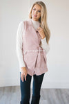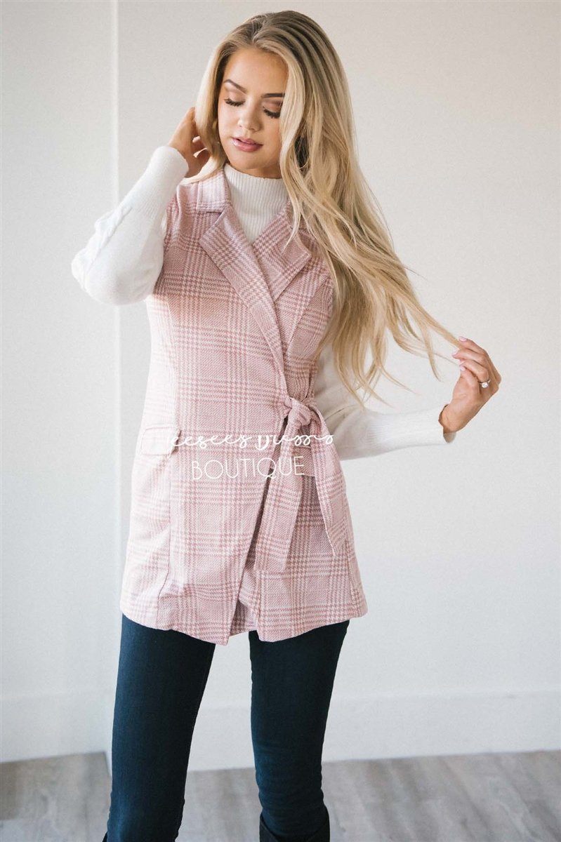 Kick autumn off the right way...in this adorable vest! This adorable new vest features a light pink and ivory glen plaid print with a self tie waist, a collared back and side pockets! The sweater is sold separate.