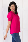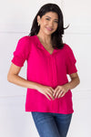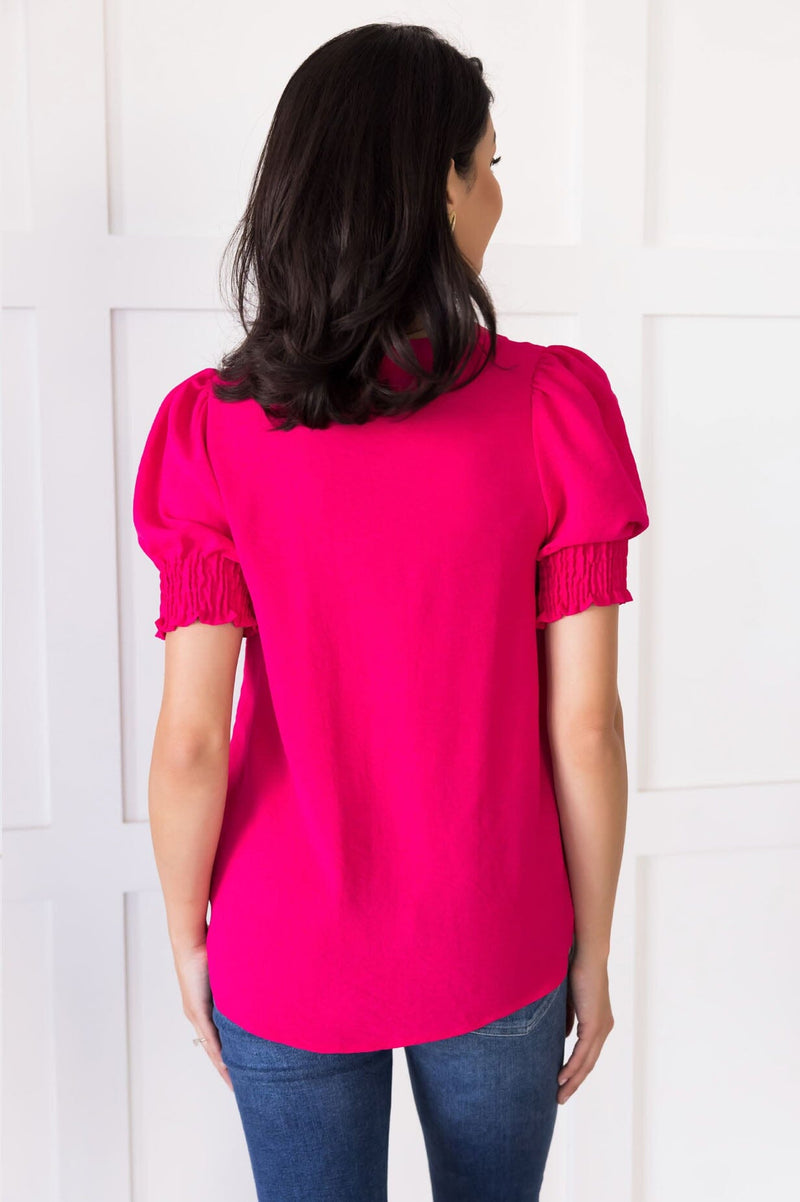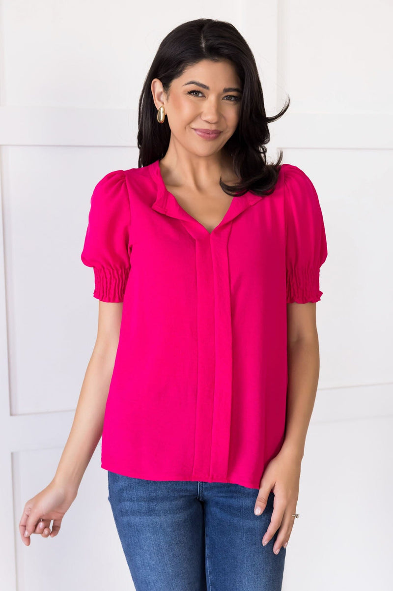 Grab this darling short sleeve top and prepare to be ready for anything! This feminine light textured beauty is the perfect for business dress up or down top. Featuring short smocked puff sleeves, classy cutout v-neckline with darling front pleat detailing and slip on style. Get yours today!