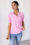 Grab this darling short sleeve top and prepare to be ready for anything! This feminine light textured beauty is the perfect for business dress up or down top. Featuring short smocked puff sleeves, classy cutout v-neckline with darling front pleat detailing and slip on style. Get yours today!