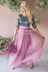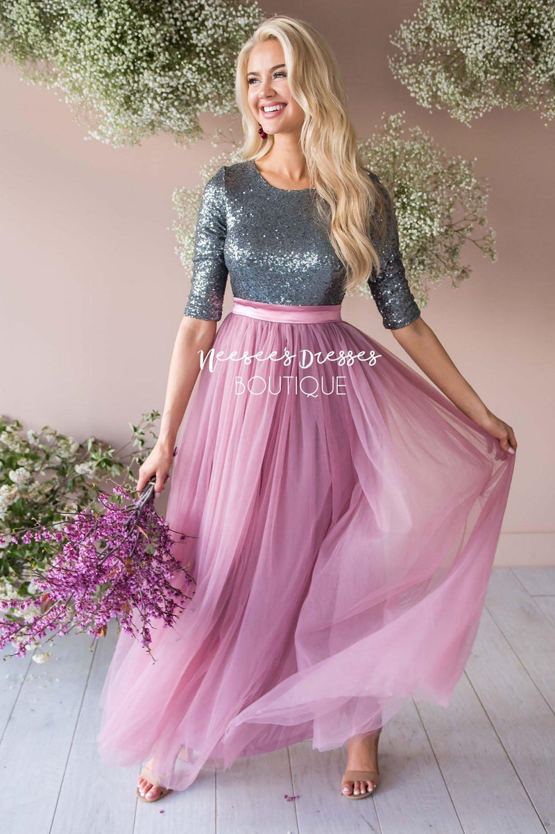 We can't put into words how breathtaking this dress is, you will feel like a true princess when you wear it! We promise you won't want to let it pass you by! Our Prima Ballerina Full Length Gown features a flattering 3/4 length sleeve, round neckline bodice that is covered in gray silver sequins and followed by a dusty mauve satin waist band and long tulle maxi skirt. Dress is fully lined with back zipper closure. This new sleeve length helps prevent uncomfortable rubbing of your arms against the sequins!
