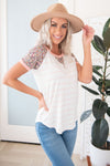 This new striped top has the most amazing features, including a soft round-neckline, short sleeves, the cutest floral sleeves that contrast the stripes so well, relaxed fit. Pair this cutie with any color jeans for the win. Get yours today!