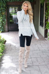 We are ready for the snowy days to come in this cozy new sweater! Light gray sweater features a cowl neck, long sleeves and a lace up side detailing. This sweater will keep you warm and cozy while still looking flawless!