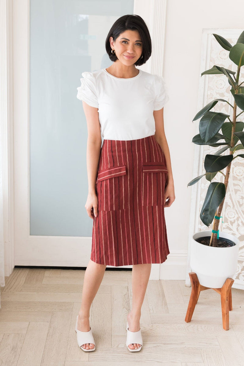 Spring and summer time are here, which means stocking up on adorable and easy to wear skirts is a must! This skirt is comfy and cute. Featuring a slip on style, midi length, cute large front pockets, and taupe, blacke and mauve stripes.