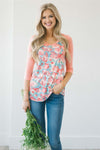 It doesn't get any cuter than this top, it is absolutely perfect for casual days. This top features a rose floral print on a teal bodice with coral peach sleeves!