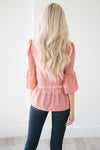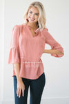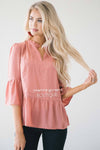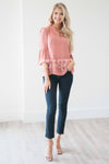 This adorable new top features a ruffle neck detail, a v neck line, a peplum hem and bell sleeves!
