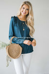 We are in love with chambray this season! This long sleeve top features a dark chambray with long sleeves and a ruffle shoulder detail!