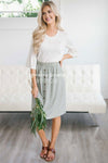 Don't blink or this beautiful skirt will be gone! Beautiful sage aline skirt features an elastic waist band, button details down the front, white pinstripe details and is fully lined.
