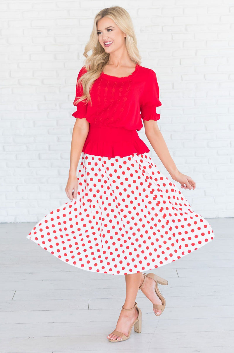 The Shade of Happiness Smocked Modest Blouse is a must have! This darling blouse features tiny ruffles around the neckline, a smocked peplum bodice for a beautiful feminine finishing touch, and smocked 3/4 length sleeves. We simply adore it, and we're sure you will too!