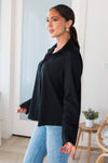 Shake up your wardrobe and add this perfect little addition! Everyone needs a classic black button up because it will literally pair with everything you own! Super cozy fabric and collared neckline make this button this week's must have!