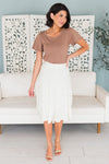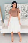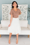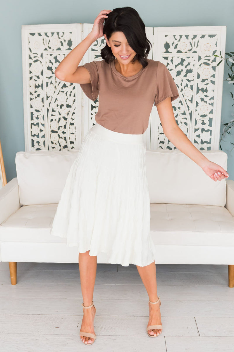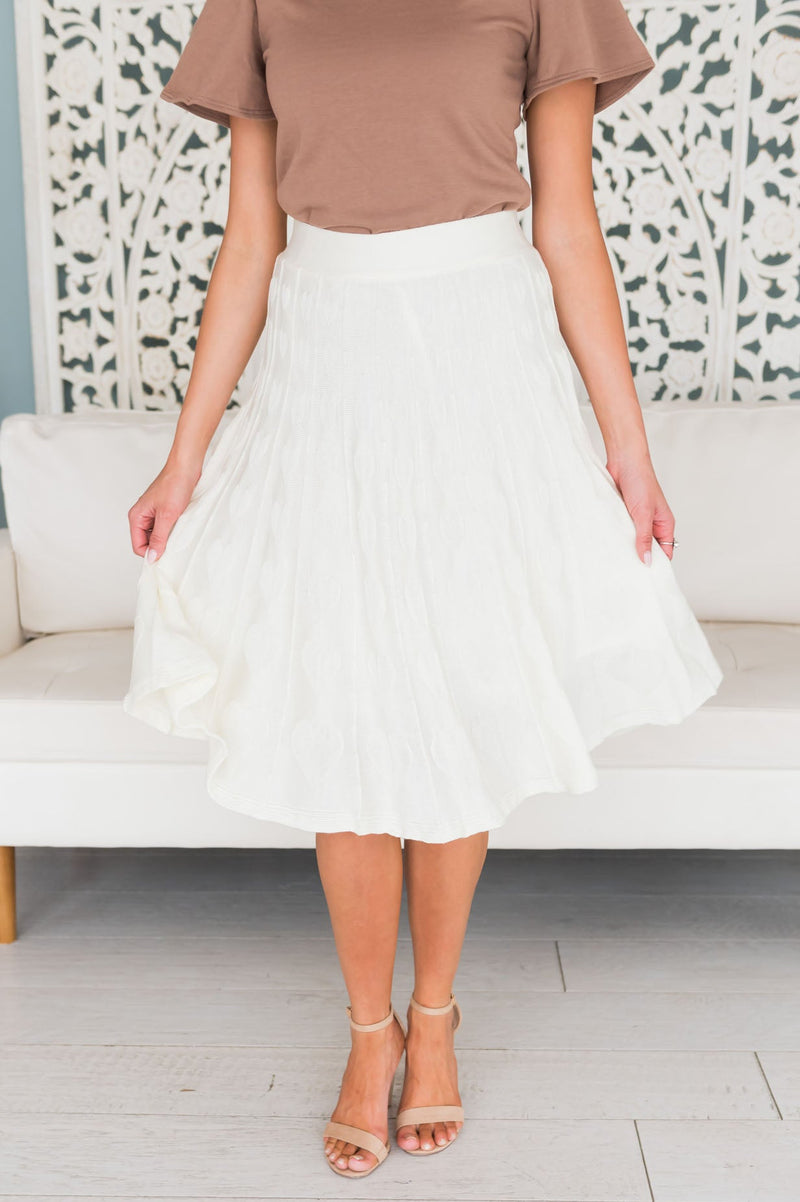 Say hello to the most darling modest skirt you will ever own! We are loving the flattering ivory with beautiful heart design. The fit and flare style is a must have for any body shape! Get yours today!