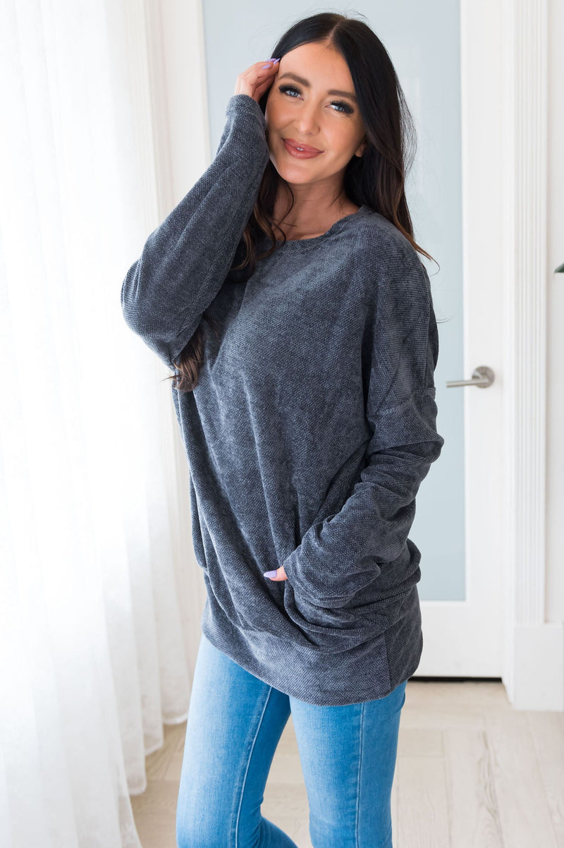 This gorgeous new She's Got It Modest Chenille sweater is so feminine! A true must have for every wardrobe! This sweater will carry you from season to season with ease and the front pocket design is so irresistible!