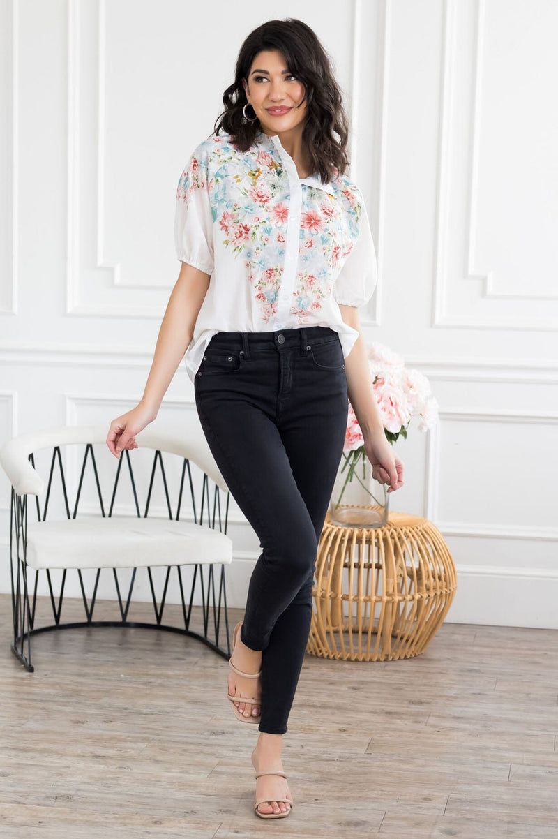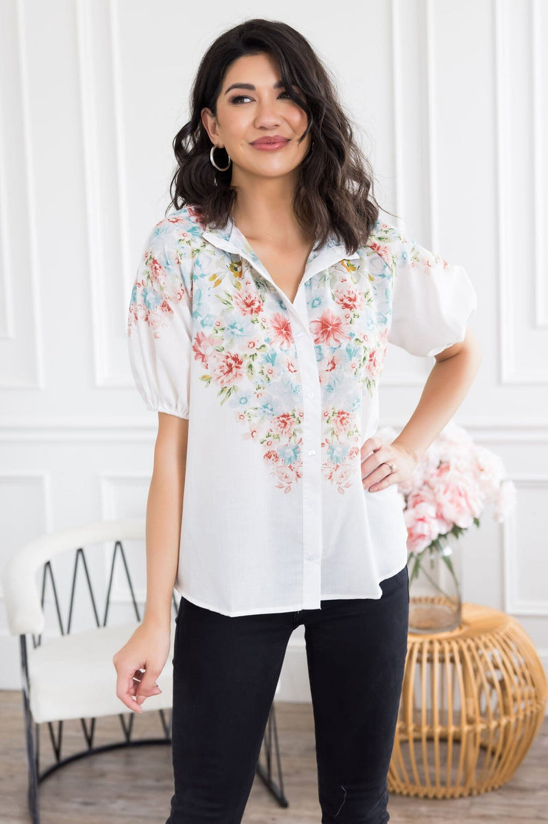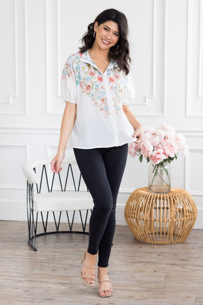 This gorgeous pastel floral top will bring a little feminine touch to any outfit! If you've been on the search for the perfect blouse to add to your wardrobe, look no further! Features includes lovely functional button front, short puff sleeves and a flattering flowy fit! Get yours today!
