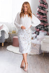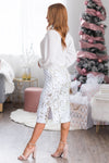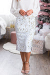 Talk about shimmer, shine and class! This gorgeous new sequin skirt has got it all! You can not go wrong with this beauty, the modest side slits are so flattering and the to die for color is the perfect pair with any top! Get yours today for all of your holiday events!