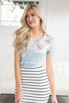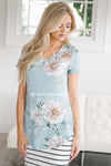 So soft, so cute, so simple! Pair this dusty aqua floral top with jeans or tucked into a skirt for your Sunday outfit. Features a v-neckline and short sleeves.