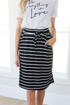 How perfect is this skirt? Simple and so easy to wear! Featuring the cutest stripes, pockets and tie waist.