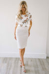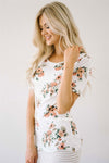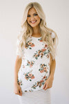 This top features the softest material and prettiest floral print! Wear it with your jeans or mix and match it with all of your skirts. Beautiful ivory top features a peach and sage floral print, round neckline and flattering half sleeves.