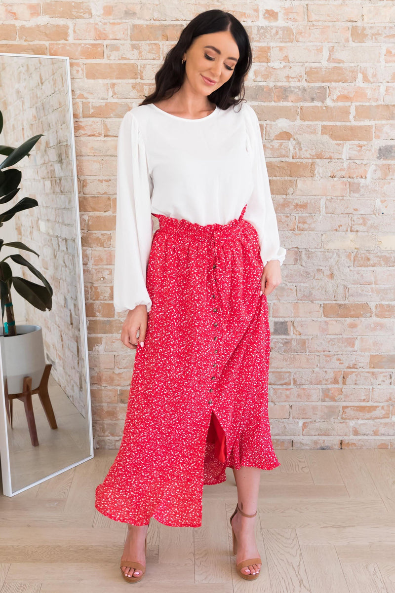 We can't get enough of our newest Spring Blooms skirt! They are so flattering on every body type, and are perfect for any occasion! They have all the best features, such as an elastic band waist, perfect maxi length and feminine faux button front design. Make sure to get this darling skirt for your Spring wardrobe!