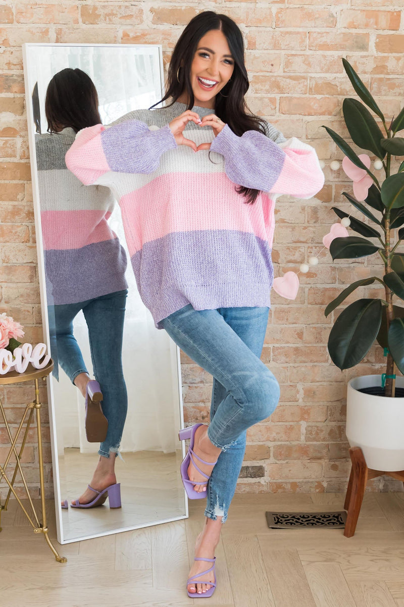 We love our new Stay Sweet sweater! It is so cute and oh-so comfy, we have never seen such beauty! It features heather grey, ivory, pink, and lavender colorblock, long sleeves, and an oversized fit! This sweater is sure to sell out, so hurry and gets yours today!