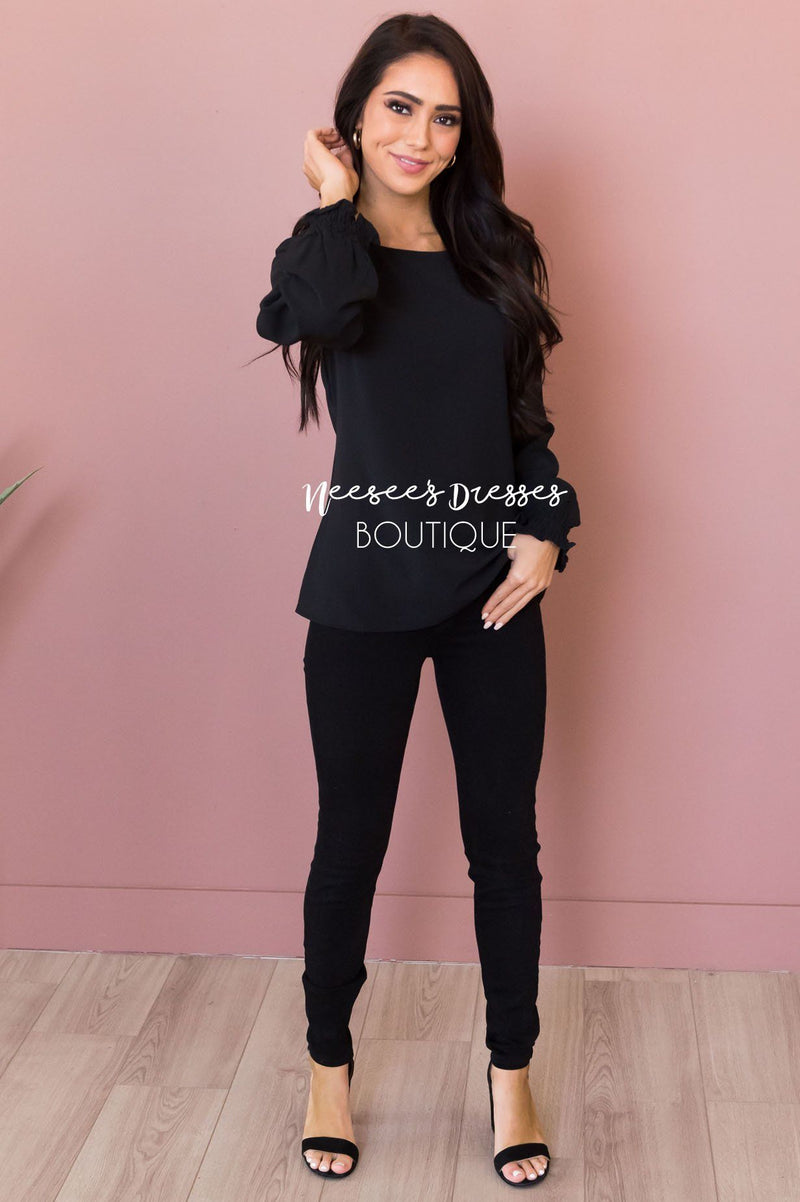 We are absolutely over the moon excited to share this top with you! Gorgeous all around in one little top! Classy black with a ton of detail! Featuring the most darling shirred ruffle sleeves & perfect modest length. You're about to be over the moon too!