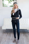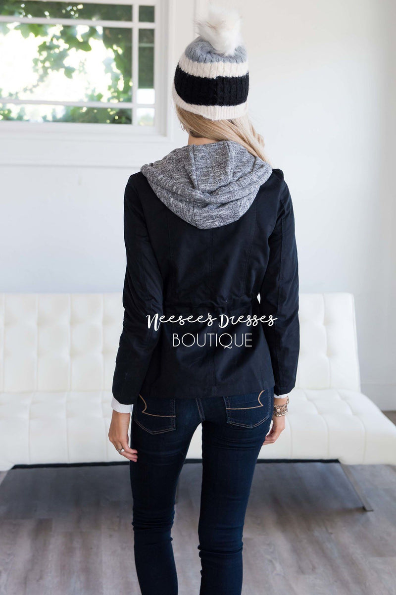 Kick autumn off the right way...in this adorable jacket! This is the perfect style to wear to those chilly football games! Black, hooded cargo jacket with double front zippers. Built-in grey lining on front. This jacket features zip pockets on chest, and pockets at waist. Drawstrings on hood and at waist for an adjustable, tailored fit.