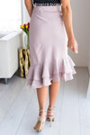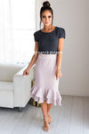 This new pencil skirt is to die for! We fell in love instantly! This mauve skirt features thin white stripes, the perfect pencil fit and an asymmetric ruffle hem!
