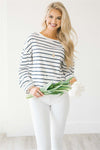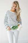 These new stripes bubble sleeve tops are the perfect go to top! Pair with your favorite jeans or skirt there is no way you can go wrong! This white top features navy stripes and long bubble sleeves!