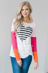 Shop our collection of the cutest Valentines Day tops! This white long sleeve top features a striped heart print and colorblock sleeves.