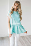 This new peplum top features mint and ivory stripes with lace trim short sleeves and a peplum hem!