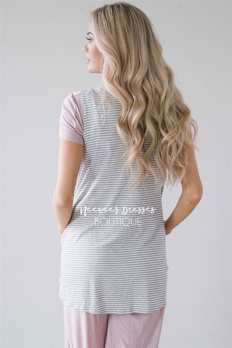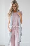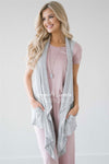Talk about adorable, we are obsessed with this new vest! It is the perfect Spring layering accessory. Ribbed, gray and white striped vest has cute pockets and an open front.