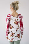 How cute is this top! It's flattering and the colors are fall perfect! Long sleeve top features burgundy and white stripe sleeves, a fall floral print body and a cute twist detail.