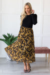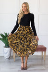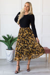 The pleated skirt of your dreams! So graceful and so lovely! Perfect for every season! This black and mustard floral features an elastic waistband and a feminine twirl worthy skirt. Get yours before they are gone!