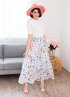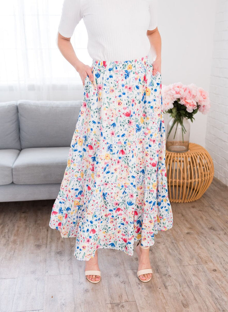 Make a statement in this beautiful new, modest, maxi skirt! This maxi skirt is comfy and so pretty too. Featuring a slip on style, pockets, and a colorful and pretty floral print.