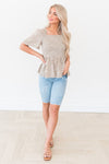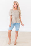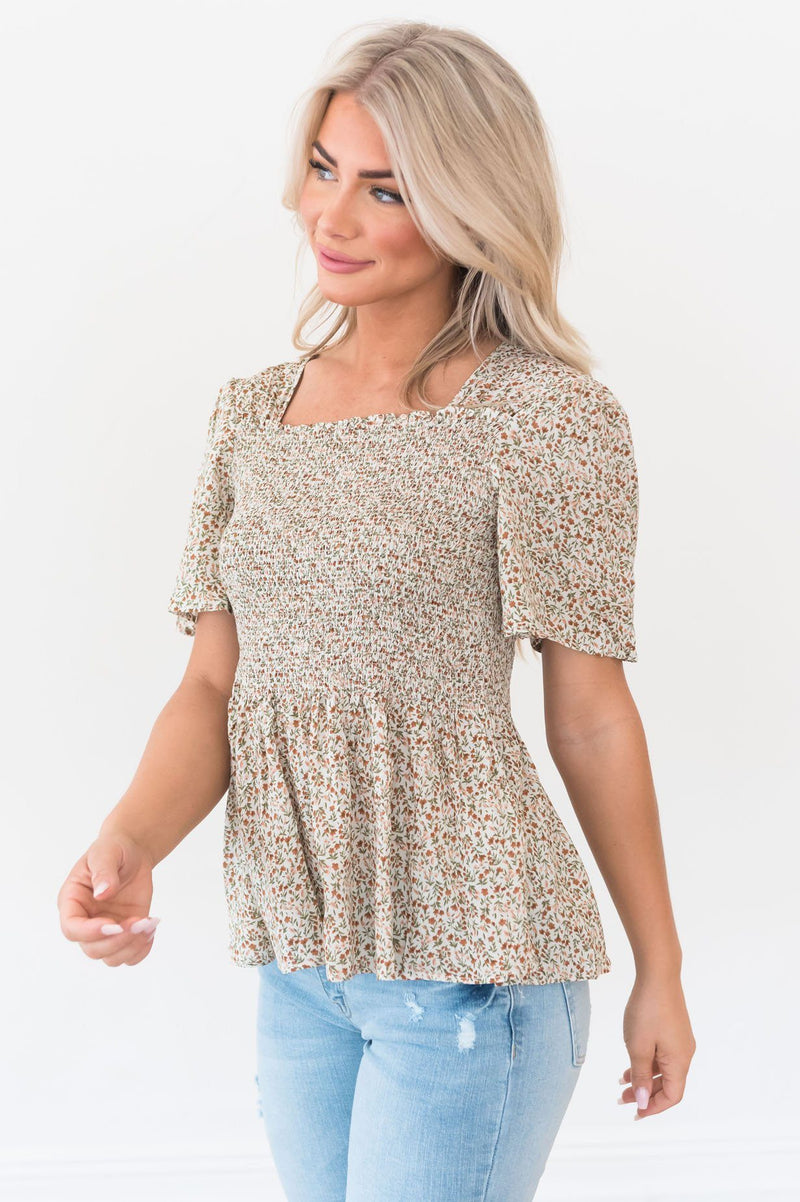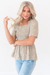 This new blouse is just blissful! We love the beige color, square neckline, short flutter sleeves, a smocked peplum bodice, and the gorgeous dainty brown and tan floral print throughout! You'll want this blouse for your summer wardrobe!